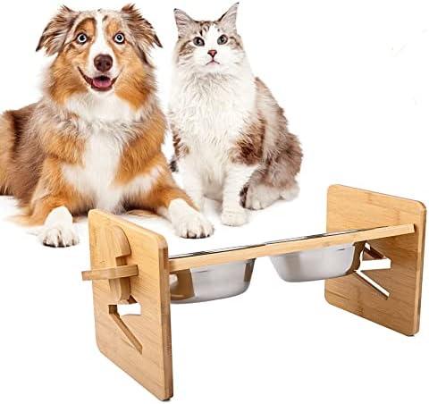 Wisfor Double Cat Dog Bowls Elevated Pet Food Water Bowl Bamboo Cat Feeder Stand 15 Tilted Adjustable Cat Food Dish With Stand And 2 Stainless Steel Feeding Bowls For Cats And Small Dogs